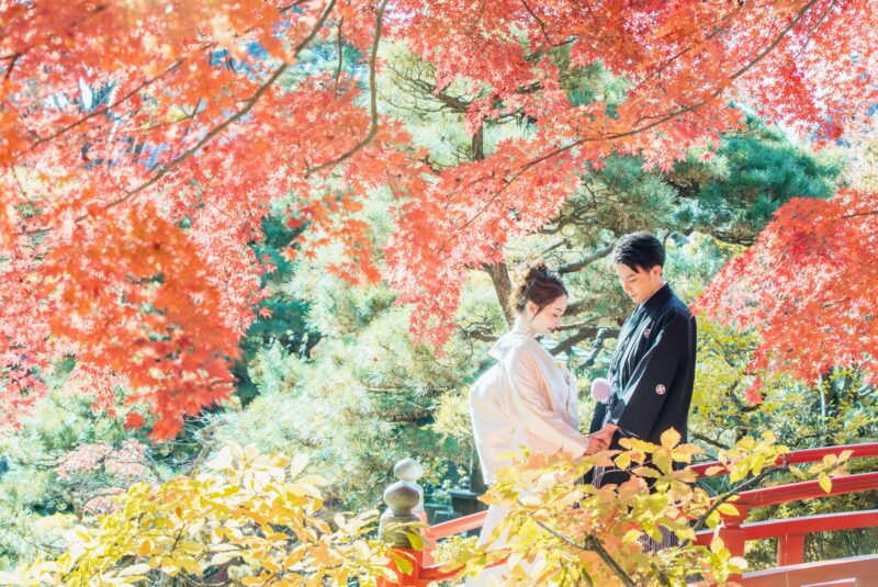 日本の美しい秋。秋風薫る紅葉フォトウェディング!紅葉のシーズンは和装でのロケーションフォトにもってこい!ご希望のロケーションをお伺いし、おふたりらしい前撮りやフォトウェディングのお手伝いをさせて頂きます。