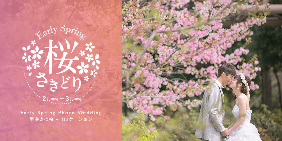 一般的な桜の開花時期より1~2か月ほど前に咲く、早咲きの桜でロケーションフォトウェディング。見ごろの桜ロケーションと、もう1箇所お好きなロケーションをセレクトして撮影できる大変お得なプランです!